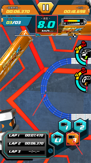 3、竞赛过程中关注【速度-8.0km/h】和回合进度,在蓝色赛道上平稳驾驶,合理利用功能按钮推进比赛。