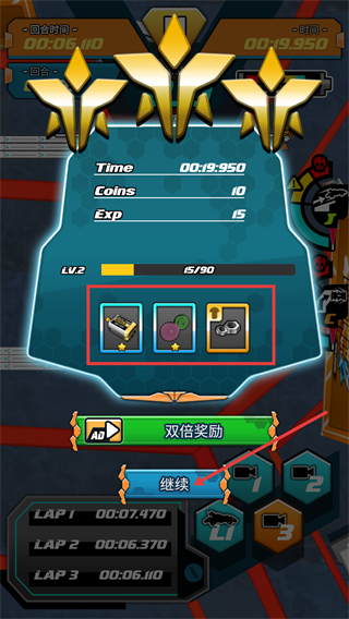 4、竞赛结束后领取【电池】【齿轮】等奖励,点击【继续】可进入下一场景,积累资源用于车辆升级或后续竞赛。