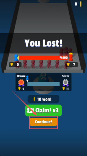 4、领取结果:在You Lost或I10won界面点击Claim!x3领取三倍奖励,或点Continue!立刻再开一局。