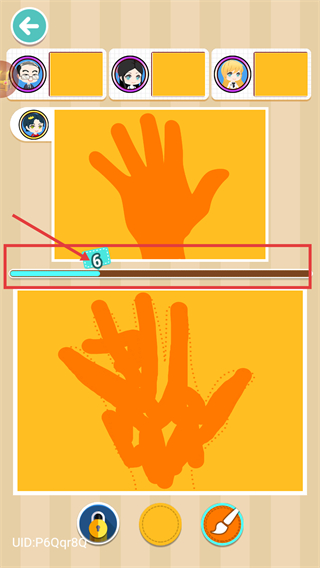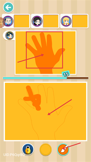 2、根据上方的【橙色手掌-轮廓】,使用底部【画笔工具】,跟随下方【虚线轮廓】进行绘制,推进当前【进度条-15】的关卡进度。