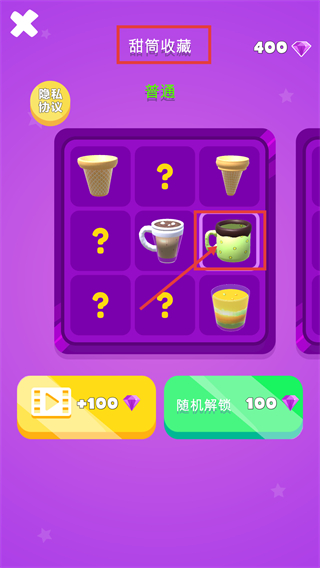 2、在【甜筒收藏】界面,消耗【100-钻石】选【随机解锁】,可获取新样式(如绿色杯子款),逐步填充收藏栏完善收集。