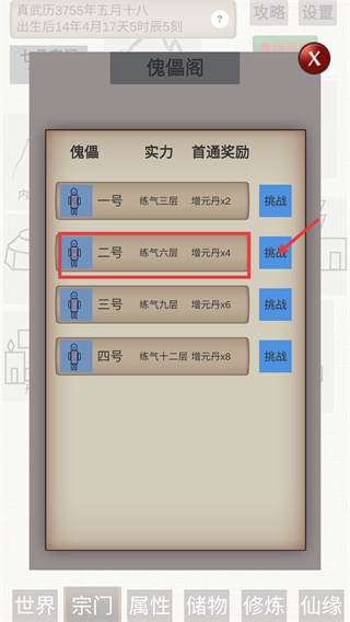 2、在【傀儡阁】界面,优先挑战【傀儡二号】,其【炼气六层】实力适配初期,通关可获取【海元丹x4】以积累资源。