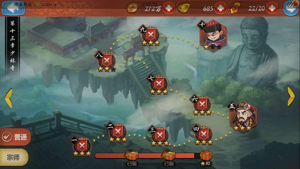 副本有宗师和普通两个难度,分章节,每章再分十个小副本,每个副本最多三星通关,每死亡一个侠客便减少一颗星,所以,想要三星通关某一个副本,不仅要有相匹配的战力,更要懂得合理搭配。