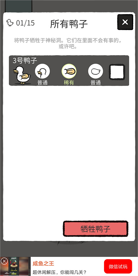 1、鸭子图鉴:可以去解锁更多的鸭子图鉴,在上面可以看到非常多的鸭子种类,打造不同种类的魔性鸭子。