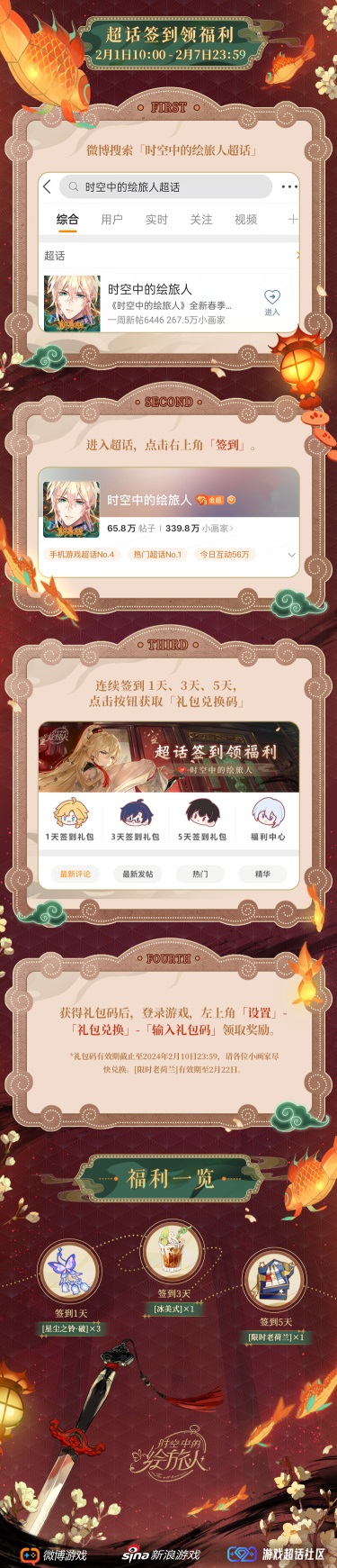 2024年2月1日 - 2月7日23:59,在《时空中的绘旅人》微博超话社区中连续签到1、3、5天,可获得[星尘之铃·破]、[冰美式]、[限时老荷兰]。
