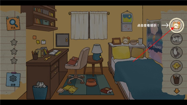 3、右侧是玩家需要找到的猫咪和物品,点击即可查看提示。