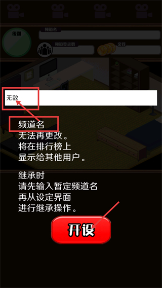 1、在界面输入【无敌】作为【频道名】,该名称无法更改且会显示在排行榜,确认后点击【开设】按钮完成频道创建。