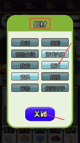 2、在【题材】选择界面中,选中【烹饪】选项,完成题材选定后,点击下方【关闭】按钮退出该选择界面。