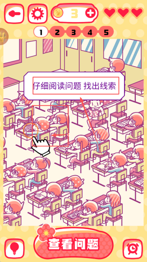 4、解锁更多关卡:成功找出问题同学后解锁新关卡,面对不同课堂情景(如语文课、数学课),持续体验找问题的趣味,享受进阶挑战。