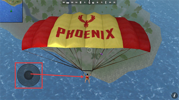 3、跳伞阶段,通过左下角轮盘控制【PHOENIX】标识的降落伞方向,调整落点至资源丰富区域,提升发育效率。