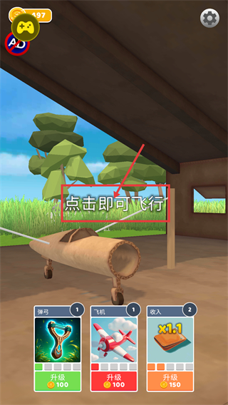 1、界面提示【点击即可飞行】,可消耗100金币升级【飞机】等道具,完成升级后触发飞行操作推进游戏进程。