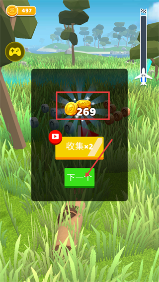 4、飞行结束后获得【269】金币奖励,可点击【下一个】继续飞行,也能看广告选择【收集×2】获取双倍奖励。