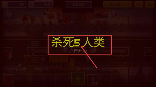 2、触发【杀死5人类】任务,点击界面内的【点击开始】按钮启动任务,推进当前【0/17】的击杀进度,完成目标可获取对应奖励。
