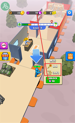 2、在装备界面消耗10钻石解锁【M16】武器,该武器具备伤害8.0、开火速度3.92的属性,可有效提升战斗输出效率。
