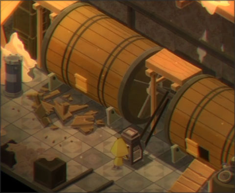 2、这个房间里,各位需要先 从最右边上到最上面架子上,来到架子的最左边,将那里的木桶推下去,然后去底下两个滚筒中间的操作台那里,将其中一个滚筒上的小口打开,然后再到木桶那把它推过去,再利用这个滚筒将其丢下来,然后推到右边的平台上,这样门就开了。