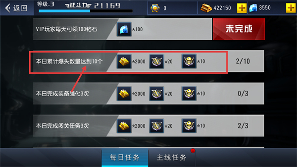 1、在【每日任务】界面,【本日累计爆头数量达到10个】进度2/10,完成可获【金币*2000】等奖励,需聚焦对应战斗目标。