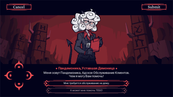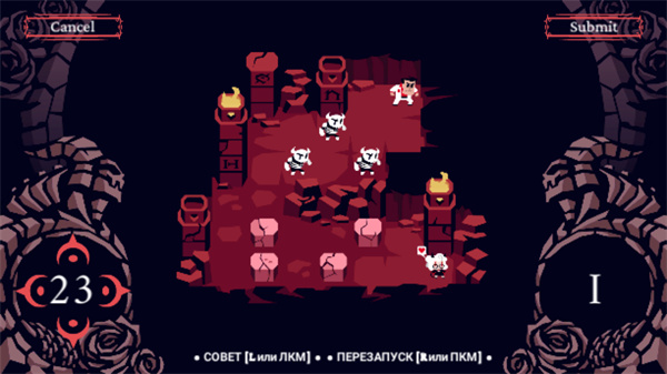 1、在本站下载并安装好Helltaker后,打开游戏后可以直接开始游玩。左上角的“Cancel”是取消,在游戏中可以暂停;右上角的“Submit”是确认,可以确定选项;左下角控制控制人物移动或者选择选项。