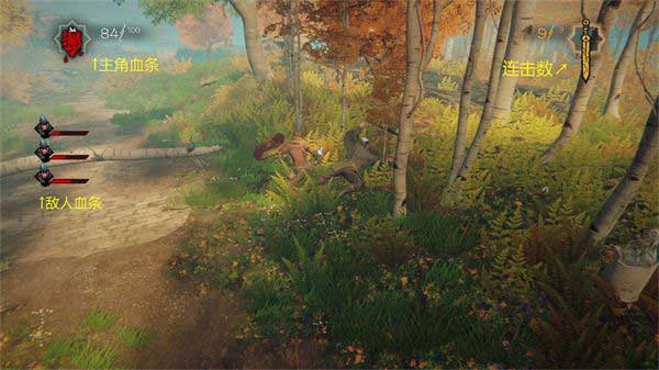 此界面包含上方的主角血条、连击数以及左边的敌人血条。