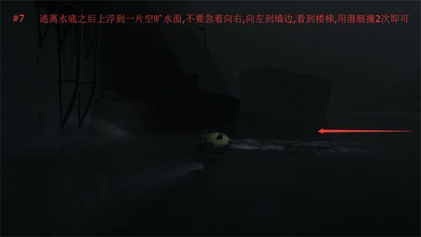 7、逃离水底之后上浮到一片空旷睡眠,不要急着向右,向左到墙边,看到楼梯,用潜艇撞几次即可