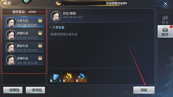 5、然后我们就能看到刚刚兑换的礼包啦,最后我们点击【领取】就行啦,也可以一键领取全部的礼包哦。