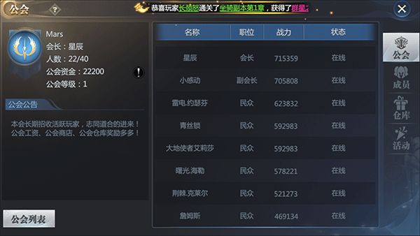最直观的显示,我们可以看到目前行会的等级、建设度、会长和公告信息,在这个页面,会长可以进行行会扩建。
