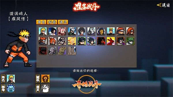 4、游戏的玩法则是完全复刻了火影忍者手游这款游戏,就是在游戏开始之前,选择人物以及通灵秘卷这些东西,然后进行横版格斗。
