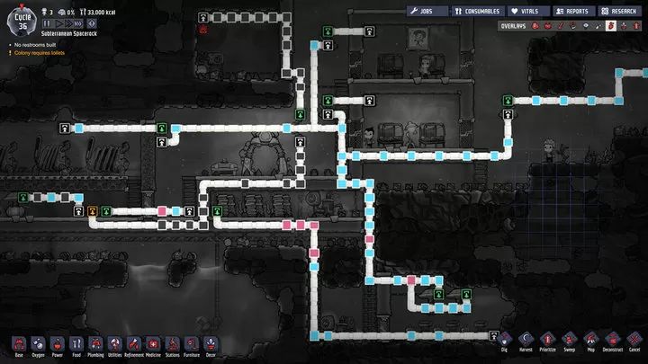 当殖民地规模扩张至占整个地下世界的1/10,大概占据3层楼的时候,你可以开始制造氧气制造机。虽然都是制氧机,但注意不是“藻类制氧机”,藻类制氧机是需要消耗电力和藻类(需要收割),而氧气制造机则是透过研发得到。