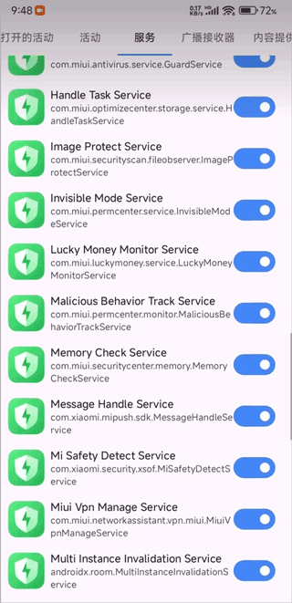 2、这时它会列举出是哪些进程服务在干扰root隐藏,把列举出的服务到手机进入管理工具软件中将该服务关闭掉