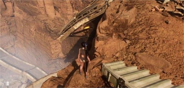 位于大沙漠。跳上悬崖上的黄色凸起,往前荡,射击目标放下绳子,然后借助绳子到达悬崖最顶端,可以看到装着罐子的箱子。
