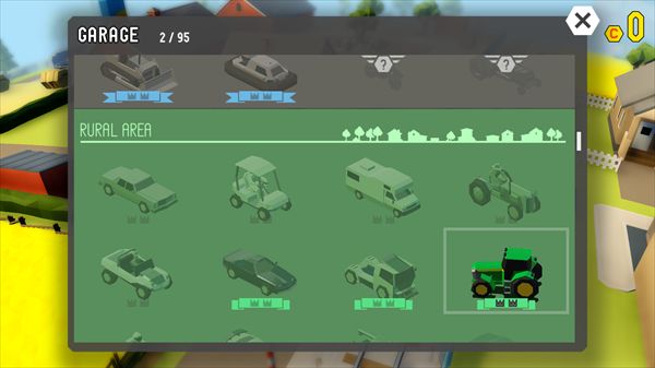 每辆车还有两个挑战,两个挑战不能同时完成,解锁第二个挑战则需要完成第一个挑战。挑战又有许多类型,比如生存一段时间,撞倒路灯,在濒死状态下生存一段时间,在空中滞留一段时间等。每完成一个便会在车辆的下方显示一个黄色的皇冠。当皇冠积累到一定的数量时,还会给予金币奖励。