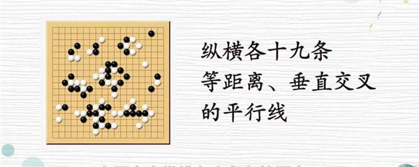 1、棋盘:盘面上有纵横各十九条等距离、垂直交叉的平行线,共构成361个交叉点,盘面上标有九个小圆点,称为星位,中央的星位又称“天元”。