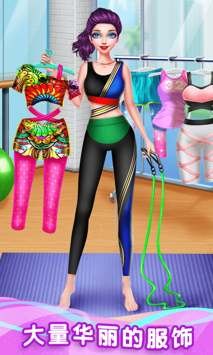 1、自由换装:选择多款瑜伽服、运动裤、头带、瑜伽垫等配饰,为瑜伽女孩打造时尚又舒适的造型;