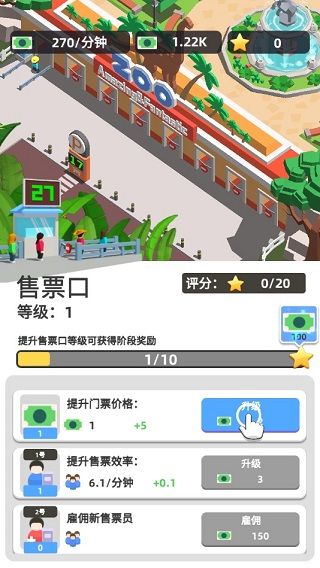 车辆挺好之后,游客会步行前往停车场购票,升级门票价格可以增加收入利润,现在点击售票口开始升级吧!