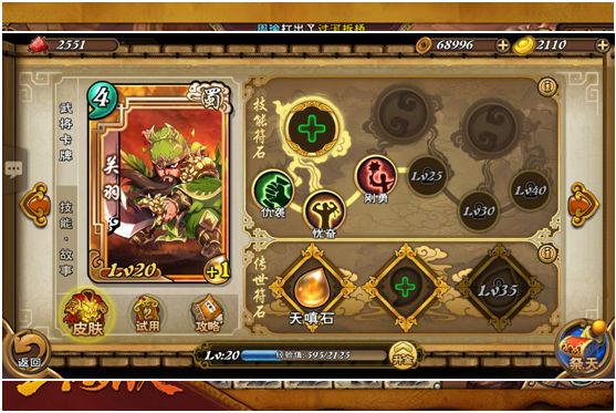 萌萌哒武将入手后,想要让他们变强可不是一朝一夕就能完成的。目前看,游戏的武将培养有以下三个途径:武将升级、镶嵌技能符石、镶嵌传世符石。符石分为进攻系、暴怒系、摸牌系、防御系四种,其作用可以理解为:增加攻击能力、增加怒气、多摸牌、增加生存能力,当然具体功效就不尽相同了。每个武将在升级后,便能够解锁更多的符石卡槽,每镶嵌两颗技能符石将会奖励一个卡槽位置,目前每个武将最多能够镶嵌9颗技能符石,以及3颗传世符石。