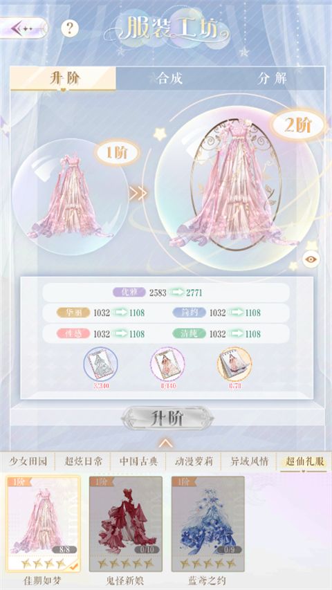 小主获得套装后可以在服装工坊为套装升阶,获得属性提升和额外的套装显示效果。除此之外服装工坊可消耗服装合成材料、金币,合成服装,分解多余时装,获得套装升阶材料