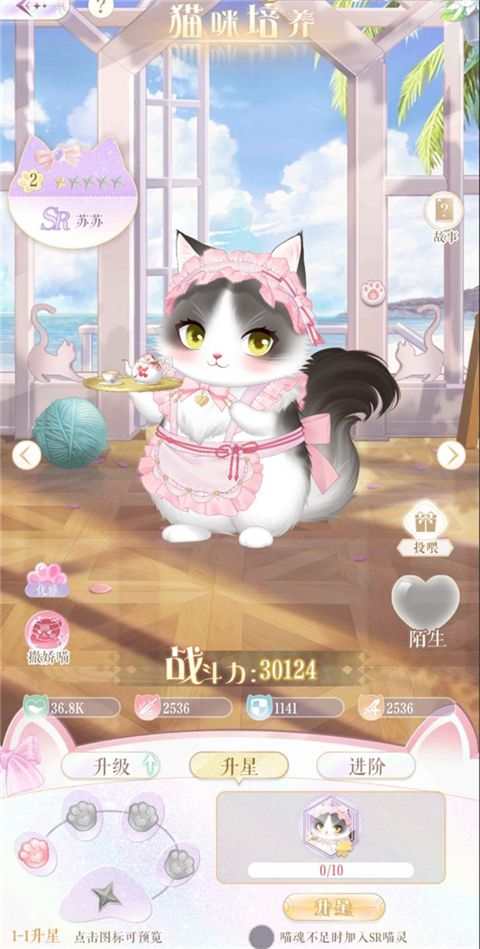 猫咪可以通过升级,升星和进阶三个方式进行养成,提升战力,升级需要消耗喵币,可以通过小镇经营和猫咪演出应援获得。
