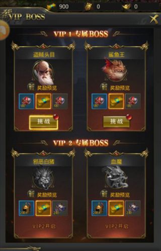 接下来系统会让玩家挑战vip boss,在这里分别有盗贼头目、鲨鱼王、邪恶白猪、血魔。