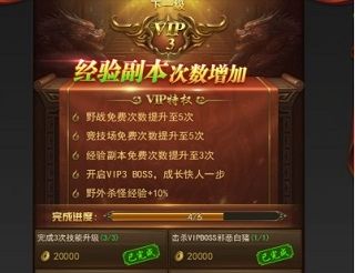 该游戏中的剧情很少,重要事件系统会用绿色字体标注出来,新手完成教程以后,就会获得vip卡,使玩游戏的体验更好。vip卡开启的特权有永久属性加成、经验副本免费次数、野战竞技场免费次数、开启vip boss、野外杀怪经验提升、装备熔炼值提升。