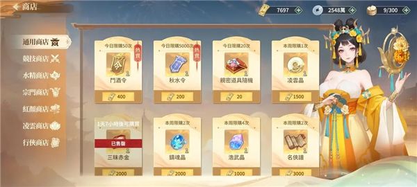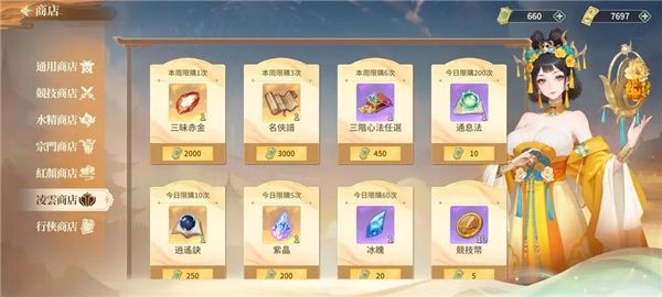 5、凌云商店其实我也比较纠结,因为货币收入极少,但三昧赤金与名侠谱都是紧缺,看个人选择吧,但是只买这两个,别的都不要买。