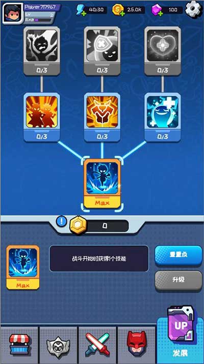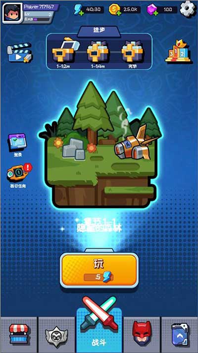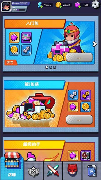 2、第一节通关后玩家将解锁商店、英雄和升级功能,玩家可利用游戏获得的钻石在商店中购买升级需要的材料;