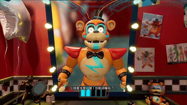 根据指示分别找到右脸颊、左脸颊、鼻子上方的小按钮并按下,欢乐弗雷迪的脸会打开。然后在脖子处有一个不太显眼的黑色按钮,按下后弗雷迪的腹部会打开,点击腹部中间闪红灯的电力模块即可。