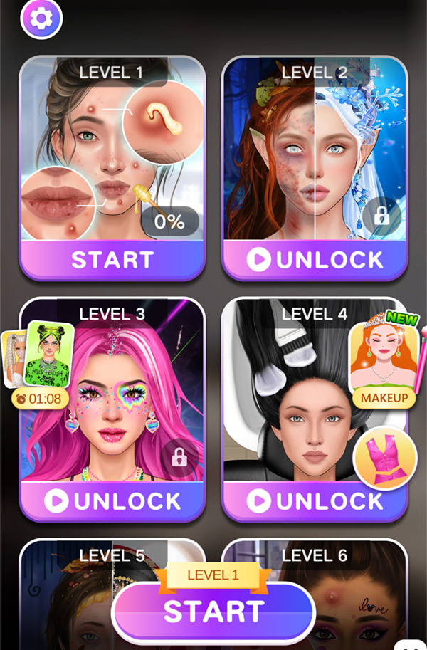1、在本页面下载并安装好尤雅美妆改造乐园后,打开游戏来到关卡选择界面,选择第一关开始挑战。