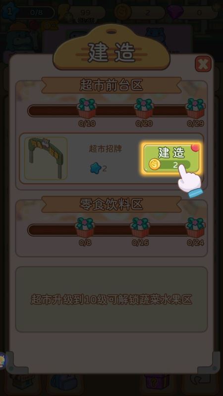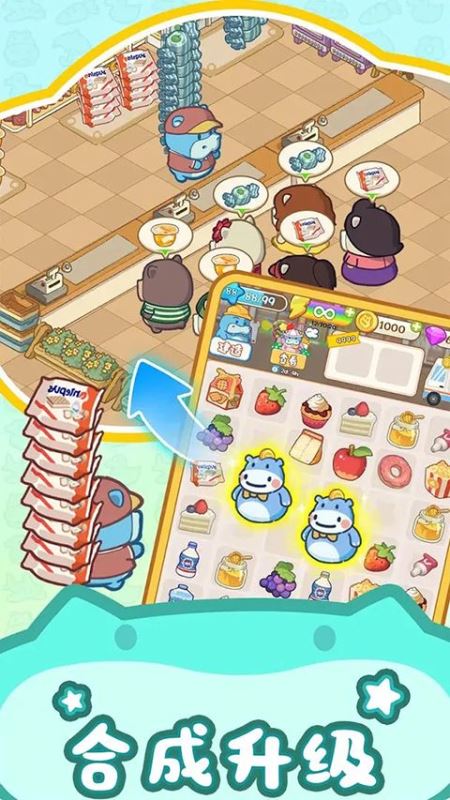 疯狂搬超市手机正版是一款模拟经营类合成手游,进入游戏后玩家需要帮助没有经营经验的小河马经营一家超市,刚开始超市里面什么都没有,需要玩家通过合成物品完成顾客的订单收获金币,才能对超市进行建设装修工作。随着后期物品解锁的越来越多,你将一步步的扩大超市的规模逐渐成为一家商城。
