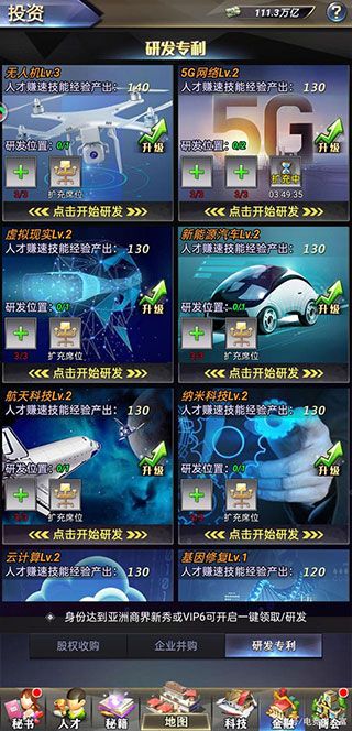 再来说一说金融里面的投资玩法,投资是有次数限制的,当然你的背包里面有投资卡,那就可以增加次数,一个投资卡可以加60次,每次投资花少量的钱增加股份,当股份到100%时,中间的企业并购就会点亮,然后会获得大量的钱和研发专利的道具,话说这个投资界面弄得还挺像真的