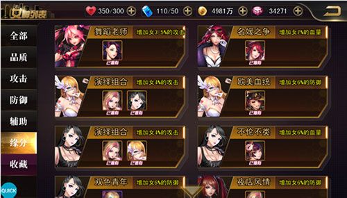 1、颜色灰置的卡牌,可以点击进行详细信息查看,方便未获取的小伙伴获知技能和属性信息并对不同属性的女神进行了整理,可以在攻击防御辅助中选择自己心仪的女神
