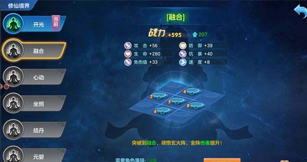 3、境界系统 ,开始的时候要达到一定境界,玩家才可以上阵多个英雄,而且境界可以为玩家增加战力,玩家可以用真气提升等级,真气获取也很多,门派比武,天命之塔,野外等等