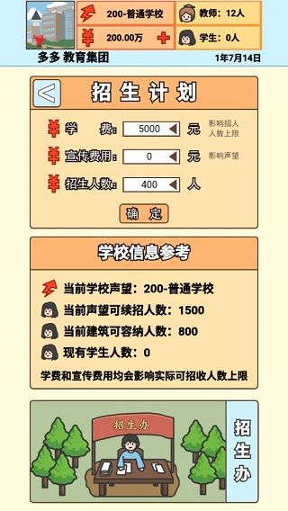 初始前期,由小秘书已为你制定好了详细的几套学费和宣传费用方案,你可以自行选择,参考下方信息,确定招生人数,进而开始你的校董一天吧!