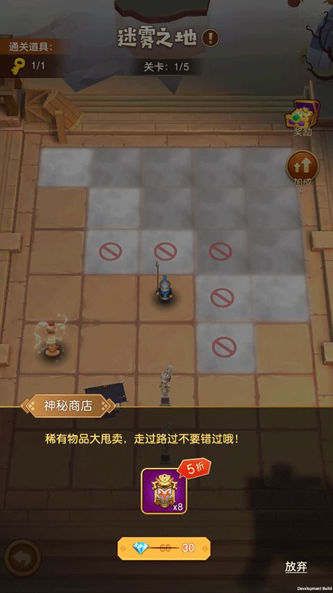 通关规则:迷雾境地共设为5个关卡。每轮关卡共有35个格子,每个格子都会触发随机事件,通过探索翻开迷雾格子找到到通关钥匙,即可通往下一关卡。最后有一个关卡为BOSS关,需打败BOSS才能成功通关。