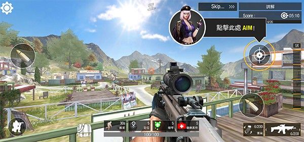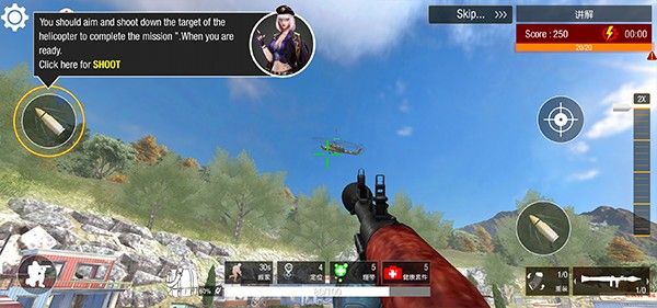 2、开镜之后就可以看到远处的敌人了,然后进行瞄准点击左上角或者右下角的开火键位射击;