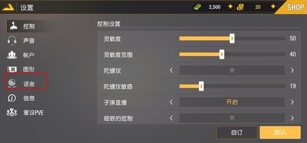 2、进入到设置页面,这里有控制、声音、账户、语言等游戏设置选择,点击选择语言;